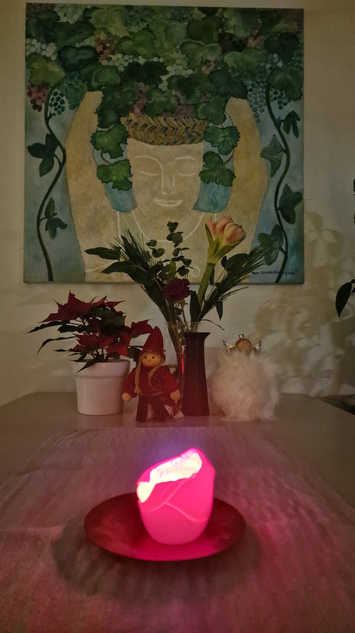 Kuuden vuoden takainen keskustelu nousi aamusta mieleen katsellessani joulukuusta ja kynttilän luomien varjojen leikkiä hyasintin vielä tuoksuessa taustalla. Juuri nyt täällä on tunnelma, jota kohdin lähdimme kotia uudistamaan.